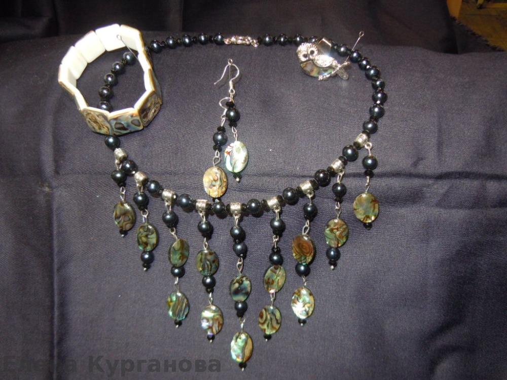 комплект из черного перламутра и черного жемчуга.Колье на проволоке держит форму. швензы серег- серебро 925 пробы.